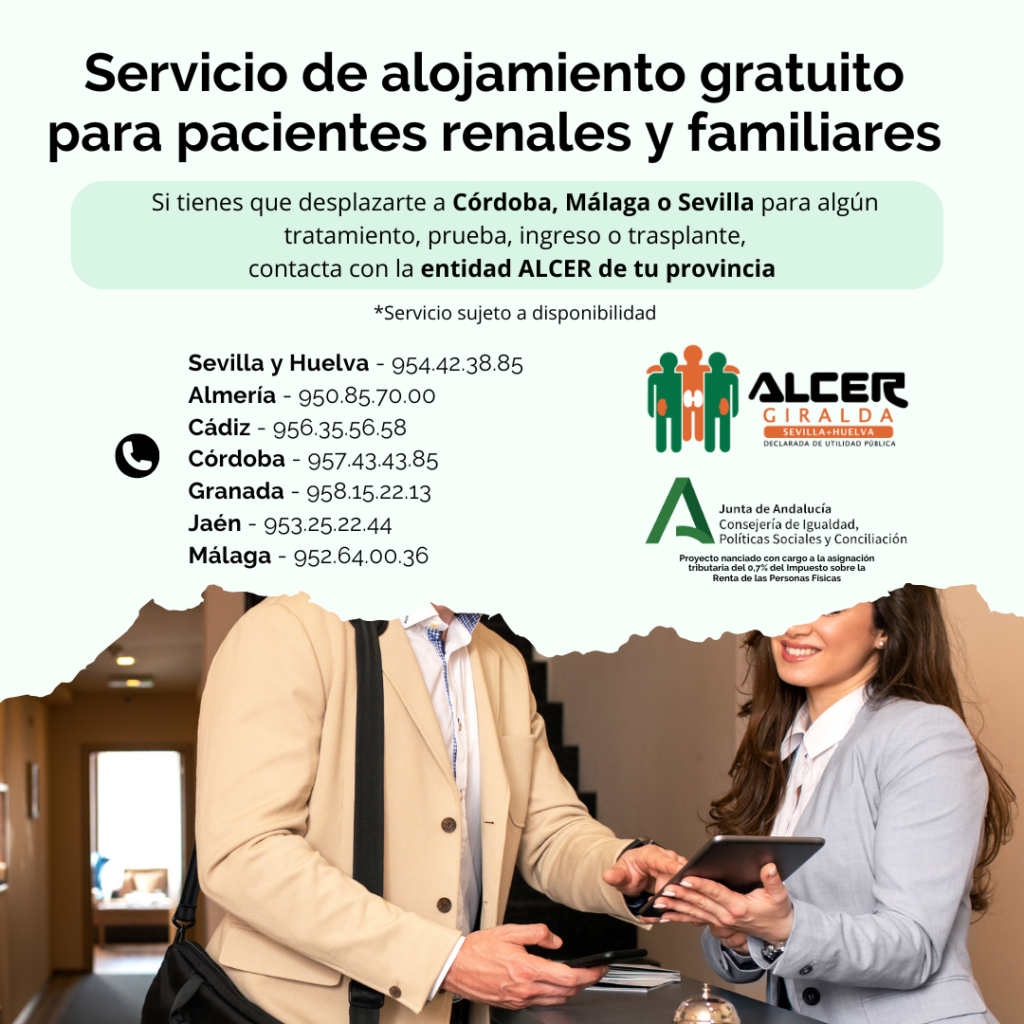Otro año más, ALCER Giralda – Huelva continúa con el Servicio de alojamiento gratuito para pacientes renales y familiares. Un servicio que posibilita el alojamiento transitorio de personas con ERC y su familia durante un periodo corto que permita el control y seguimiento de su enfermedad sin añadir un sobre coste elevado que interfiera en su economía familiar. Si ese es tu caso, no dudes en ponerte en contacto con nosotros y te ayudaremos en la medida de nuestras posibilidades.