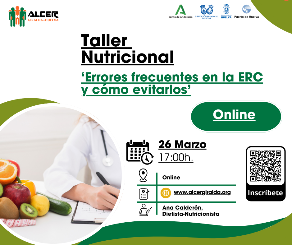 Te invitamos al Taller Nutricional “Errores frecuentes en la Enfermedad Renal Crónica y cómo evitarlos”, impartido por nuestra dietista nutricionista, Ana Calderón.