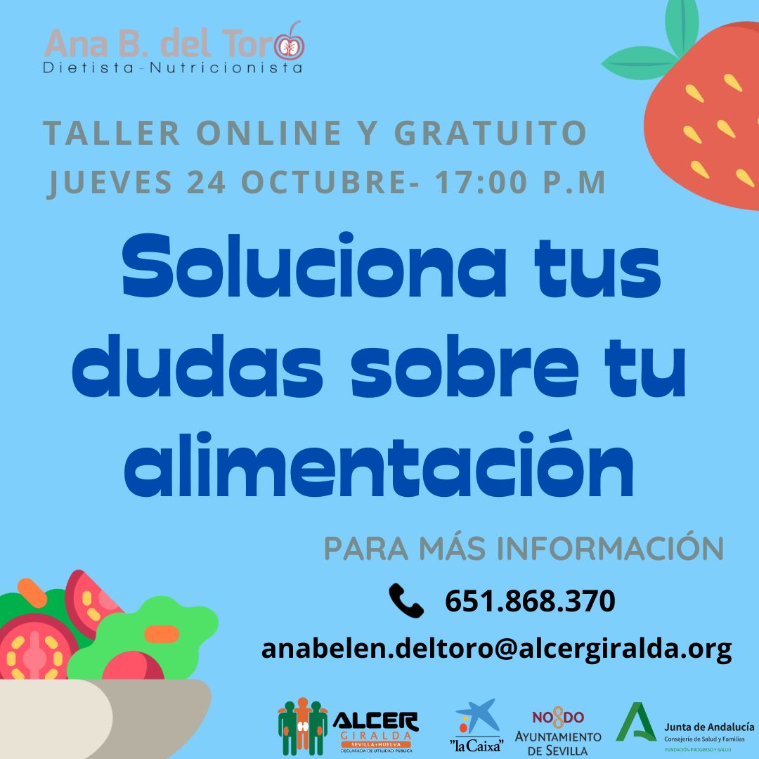 ¿Tienes diagnosticada insuficiencia renal o estás en tratamiento sustitutivo (diálisis o trasplante) y tienes dudas sobre tu alimentación o de algún alimento concreto? Apúntate a este taller y nuestra nutricionista, Ana Belén del Toro, solucionará todas las dudas.