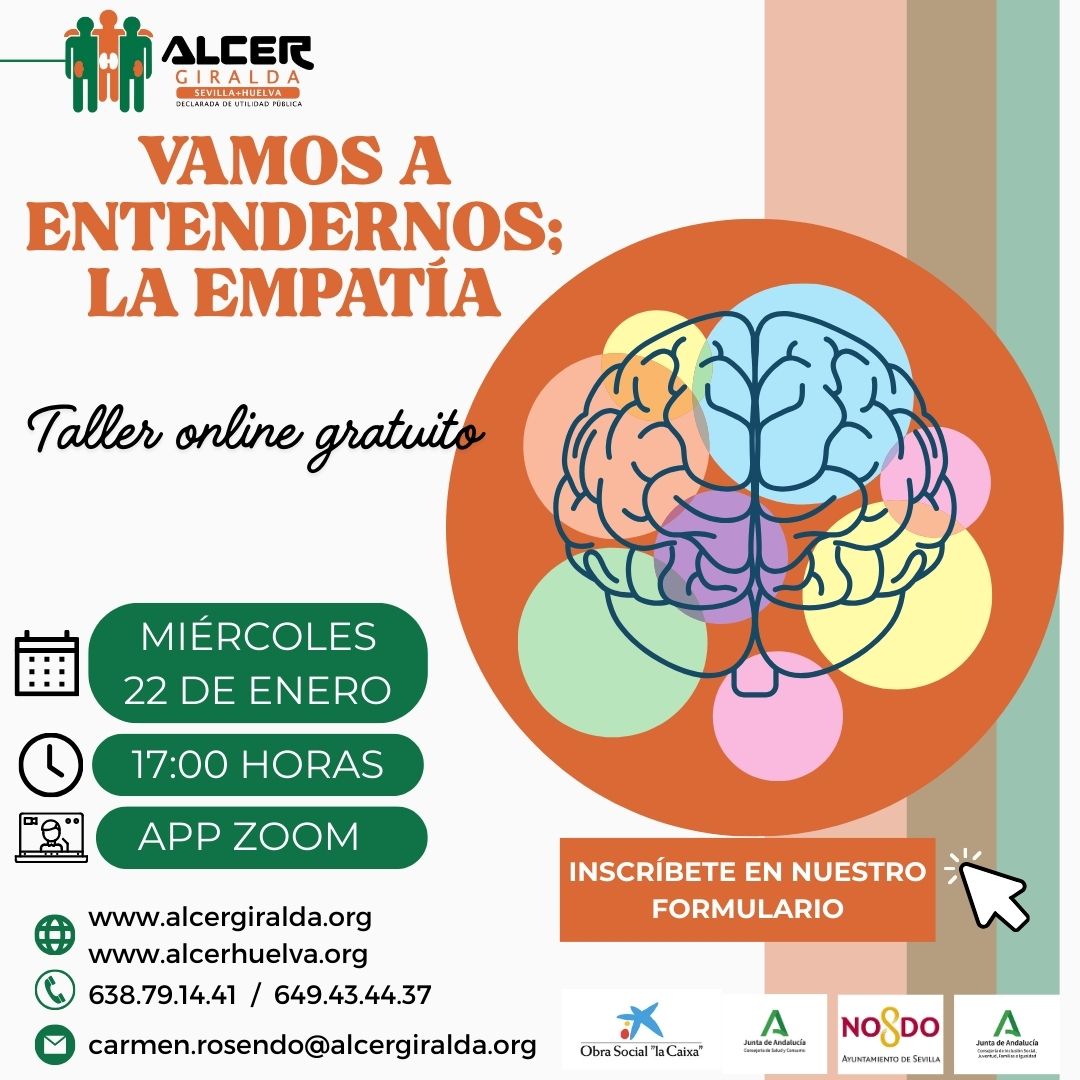 Arrancamos el año conociéndonos un poco más y aprendiendo a comprendernos. ¿Qué es la empatía?¿Cómo se presenta en nuestro día a día? Carmen Rosendo, Psicóloga en ALCER Giralda-Huelva; nos da las claves que debemos tener en cuenta para encontrar esas respuestas. Si quieres asistir a este taller online gratuito, ¡que no se te escape la fecha!
