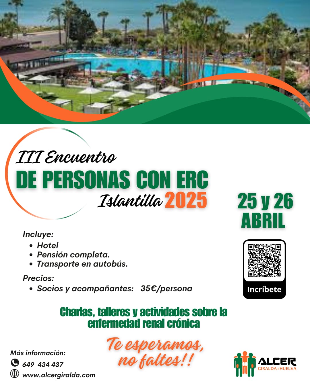 2025-04-25 III Encuentro de Personas con Enfermedad Renal Crónica (ERC) III Encuentro de Personas con Enfermedad Renal Crónica (ERC) 25 abril, 2025 - 26 abril, 2025 III Encuentro de Personas con Enfermedad Renal Crónica (ERC) 📢 ¡ALCER Giralda+Huelva organiza el III Encuentro de Personas con Enfermedad Renal Crónica (#ERC)! Reserva ya tu plaza 🗓 25 y 26 de abril 📍 Hotel Ilunion Islantilla (Huelva) 🍽 ...